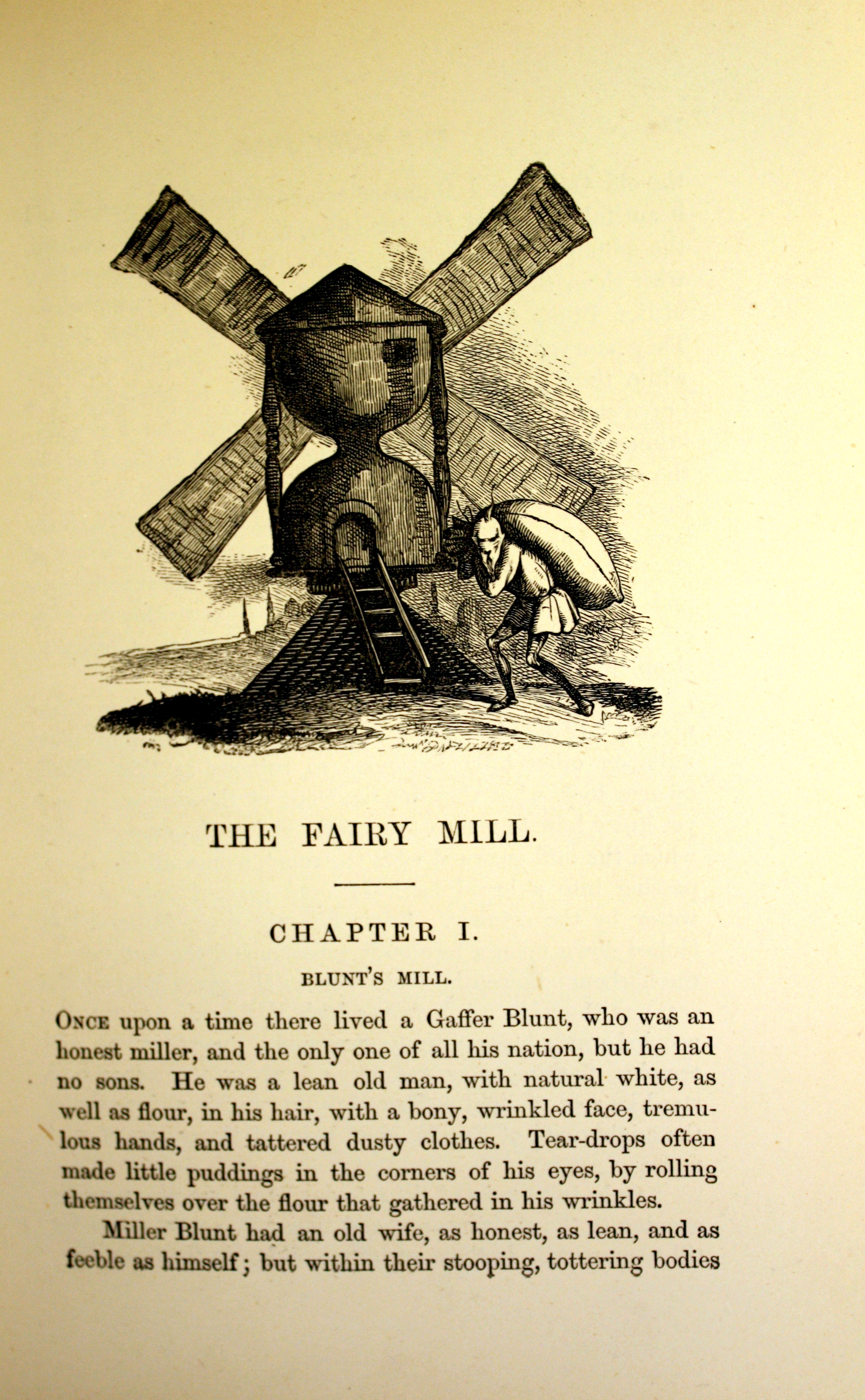 Morley’s ‘The Fairy Mill’ acts as an exposition of the author’s support of the Cooperative Movement, which sought to challenge capitalist hegemony by unionising independent retailers. The characters with which the reader sympathises are Gaffer and Gammer Blunt, proprietors of the titular Mill. Although aged, feeble and destitute they retain ‘hearts as young and beautiful as [their] child’ (p.78), their only daughter Althy. The parents sacrifice much for their daughter, starving so she can eat and freezing she may have extra blankets, and their selflessness and honest nature are rewarded one night by the fairy Twinkle. The touchstone of their mill is charmed to grind only that which is counterfeit, inferior and artificial to dust, and thus draws the attention of the King of Flavilla; the monarch decrees that the veracity of all his attendants, parliamentary legislature and product of industry be ascertained by being passed through the Fairy Mill: ‘The regeneration of the state! Grist to the mill!’ (p.84). All prove to be false, and the moral proves to be twofold.